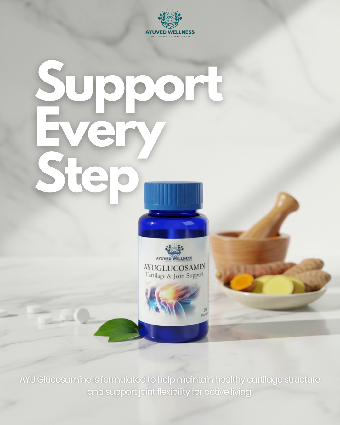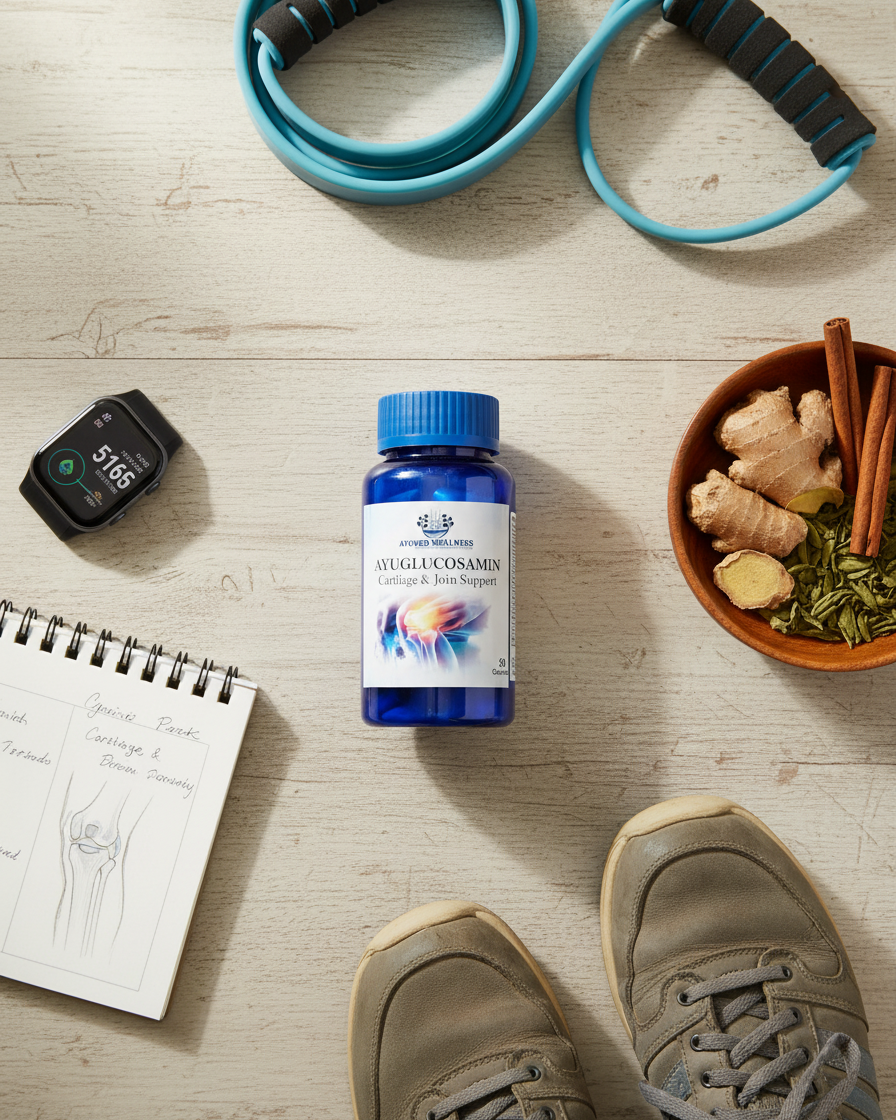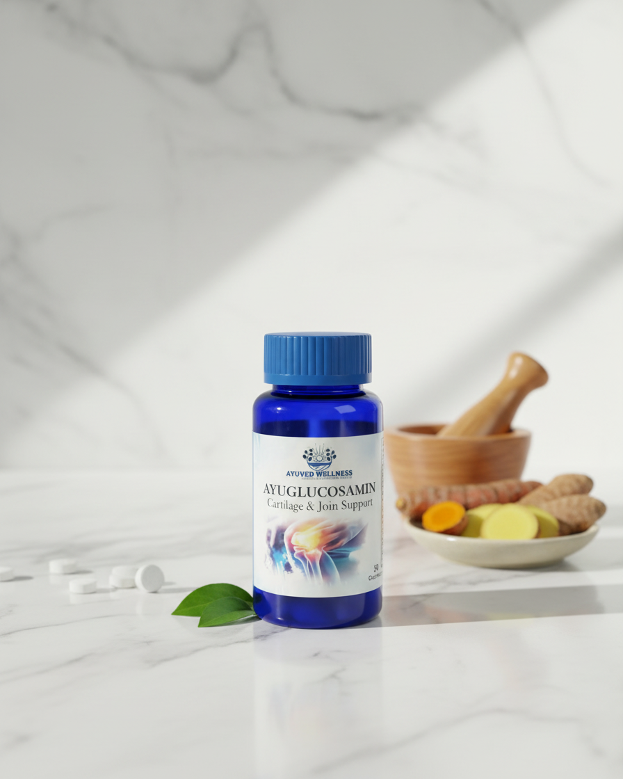 AYUGLUCOSAMIN is a gentle mix of herbs and nutrients for your joints. It helps keep your knees and elbows moving smoothly without stiffness. With the goodness of Turmeric and Rosehip, it supports strong bones and happy muscles. It is a simple, daily step to help you walk and move freely.